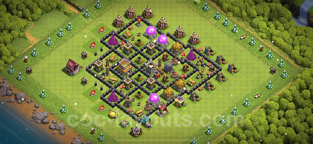 This Town Hall 8 hybrid base offers the best of both worlds - strong resource protection combined with effective trophy defense. The versatile design makes it an excellent choice for players who want to protect their loot while maintaining their trophy count. This balanced approach ensures you don't sacrifice one aspect of defense for another, making it ideal for active players across all league levels. The hybrid layout features centralized resource storages alongside a well-protected Town Hall, with multiple defensive layers that deter both farming raids and trophy pushers. High-value targets are strategically positioned within overlapping defense ranges, forcing attackers to make difficult choices about which objectives to prioritize. The compartmentalized design prevents attackers from easily achieving both loot destruction and the Town Hall kill in a single attack. Defense placement in this hybrid base creates strong coverage against both ground and air attacks. Inferno Towers, X-Bows, and Eagle Artillery work in concert to eliminate threats quickly, while splash damage defenses like Wizard Towers and Bomb Towers counter swarm strategies. The base's funnel-resistant design and strategic trap placement make it effective against popular attack strategies including QC LaLoon (Queen Charge Lava Hound Balloon), Blizzard attacks, and Yeti Smash compositions.