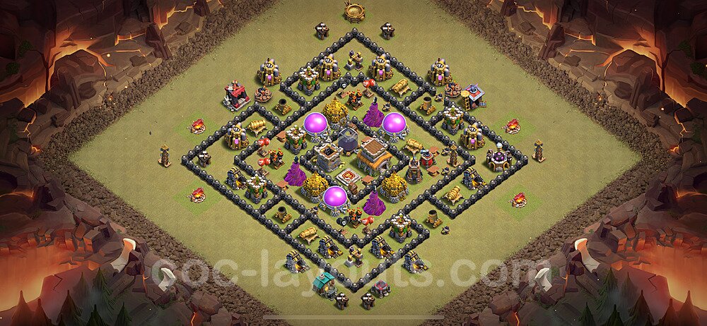 This Town Hall 8 hybrid base offers the best of both worlds - strong resource protection combined with effective trophy defense. The versatile design makes it an excellent choice for players who want to protect their loot while maintaining their trophy count. This balanced approach ensures you don't sacrifice one aspect of defense for another, making it ideal for active players across all league levels. The hybrid layout features centralized resource storages alongside a well-protected Town Hall, with multiple defensive layers that deter both farming raids and trophy pushers. High-value targets are strategically positioned within overlapping defense ranges, forcing attackers to make difficult choices about which objectives to prioritize. The compartmentalized design prevents attackers from easily achieving both loot destruction and the Town Hall kill in a single attack. Defense placement in this hybrid base creates strong coverage against both ground and air attacks. Inferno Towers, X-Bows, and Eagle Artillery work in concert to eliminate threats quickly, while splash damage defenses like Wizard Towers and Bomb Towers counter swarm strategies. The base's funnel-resistant design and strategic trap placement make it effective against popular attack strategies including QC LaLoon (Queen Charge Lava Hound Balloon), Blizzard attacks, and Yeti Smash compositions.