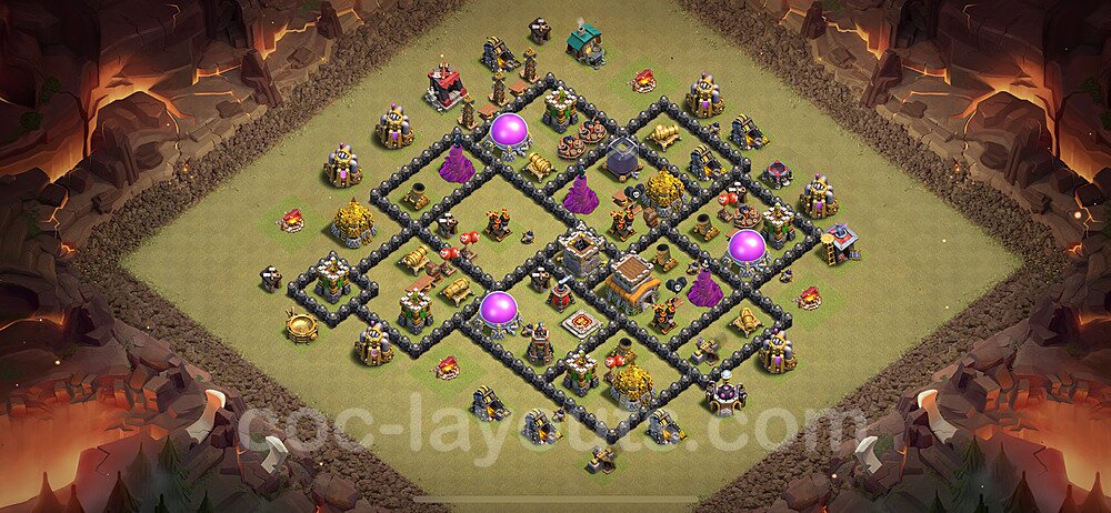 This Town Hall 8 hybrid base offers the best of both worlds - strong resource protection combined with effective trophy defense. The versatile design makes it an excellent choice for players who want to protect their loot while maintaining their trophy count. This balanced approach ensures you don't sacrifice one aspect of defense for another, making it ideal for active players across all league levels. The hybrid layout features centralized resource storages alongside a well-protected Town Hall, with multiple defensive layers that deter both farming raids and trophy pushers. High-value targets are strategically positioned within overlapping defense ranges, forcing attackers to make difficult choices about which objectives to prioritize. The compartmentalized design prevents attackers from easily achieving both loot destruction and the Town Hall kill in a single attack. Defense placement in this hybrid base creates strong coverage against both ground and air attacks. Inferno Towers, X-Bows, and Eagle Artillery work in concert to eliminate threats quickly, while splash damage defenses like Wizard Towers and Bomb Towers counter swarm strategies. The base's funnel-resistant design and strategic trap placement make it effective against popular attack strategies including QC LaLoon (Queen Charge Lava Hound Balloon), Blizzard attacks, and Yeti Smash compositions.