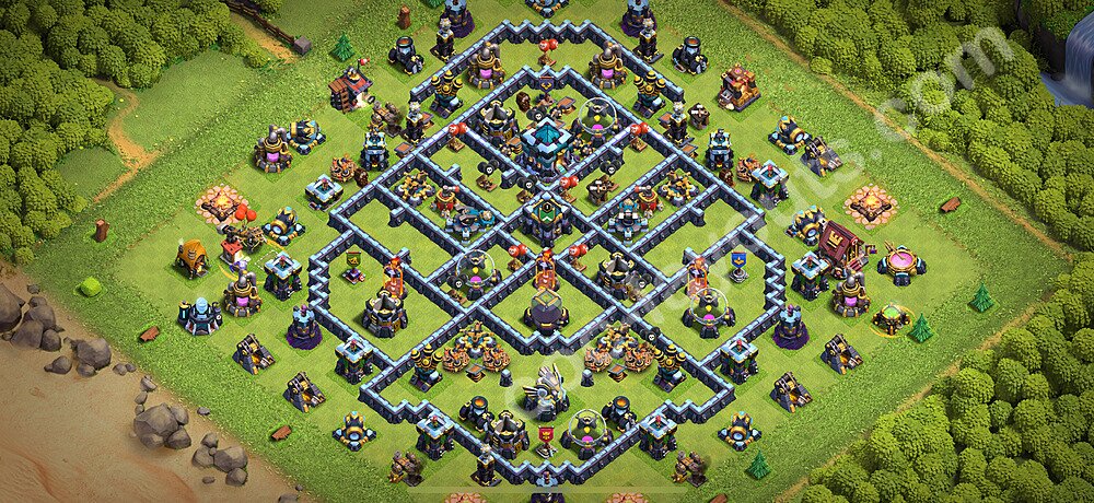 This Town Hall 13 farming base is optimized to protect your resources including Gold, Elixir, and Dark Elixir from raiders. The layout features centralized storages with multiple compartments that make it extremely difficult for attackers to steal large amounts of resources in a single raid. This design philosophy prioritizes resource protection over trophies, making it ideal for players focused on upgrading their village. The strategic placement of resource storages ensures they are well-protected by high-damage defenses like X-Bows, Inferno Towers, and Eagle Artillery. Each storage is surrounded by multiple wall layers and defensive structures, forcing attackers to invest heavily in troops and spells to reach your loot. The farming base design also incorporates strategic dead zones where attackers' troops tend to path inefficiently, wasting time and taking heavy damage from nearby defenses. Collectors and mines are positioned on the outer edges as "bait" while your main storages remain heavily protected in the core. This layout has proven effective against common farming strategies like BARCH (Barbarians + Archers), GoWiPe (Golems + Wizards + Pekka), and mass Miner attacks. The compartmentalized design prevents attackers from funneling straight to your resources, ensuring you maintain your hard-earned loot for important upgrades.