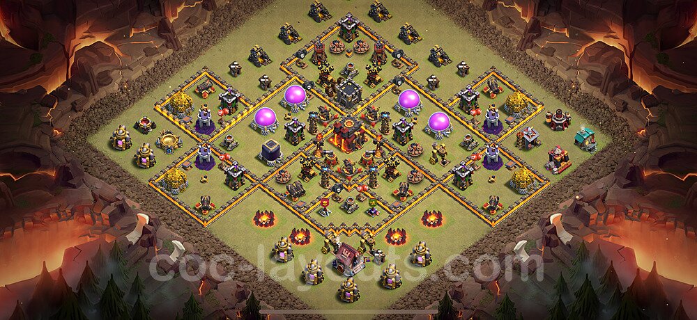 This Town Hall 10 hybrid base offers the best of both worlds - strong resource protection combined with effective trophy defense. The versatile design makes it an excellent choice for players who want to protect their loot while maintaining their trophy count. This balanced approach ensures you don't sacrifice one aspect of defense for another, making it ideal for active players across all league levels. The hybrid layout features centralized resource storages alongside a well-protected Town Hall, with multiple defensive layers that deter both farming raids and trophy pushers. High-value targets are strategically positioned within overlapping defense ranges, forcing attackers to make difficult choices about which objectives to prioritize. The compartmentalized design prevents attackers from easily achieving both loot destruction and the Town Hall kill in a single attack. Defense placement in this hybrid base creates strong coverage against both ground and air attacks. Inferno Towers, X-Bows, and Eagle Artillery work in concert to eliminate threats quickly, while splash damage defenses like Wizard Towers and Bomb Towers counter swarm strategies. The base's funnel-resistant design and strategic trap placement make it effective against popular attack strategies including QC LaLoon (Queen Charge Lava Hound Balloon), Blizzard attacks, and Yeti Smash compositions.