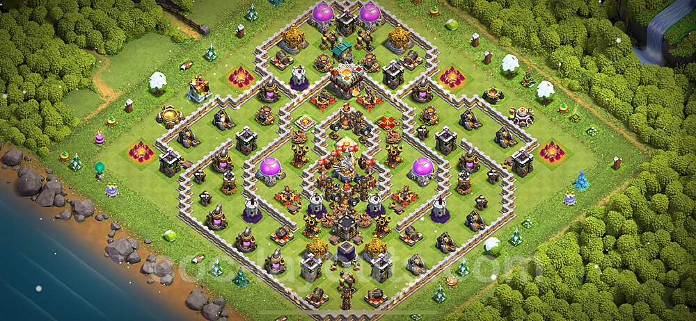 This Town Hall 11 hybrid base offers the best of both worlds - strong resource protection combined with effective trophy defense. The versatile design makes it an excellent choice for players who want to protect their loot while maintaining their trophy count. This balanced approach ensures you don't sacrifice one aspect of defense for another, making it ideal for active players across all league levels. The hybrid layout features centralized resource storages alongside a well-protected Town Hall, with multiple defensive layers that deter both farming raids and trophy pushers. High-value targets are strategically positioned within overlapping defense ranges, forcing attackers to make difficult choices about which objectives to prioritize. The compartmentalized design prevents attackers from easily achieving both loot destruction and the Town Hall kill in a single attack. Defense placement in this hybrid base creates strong coverage against both ground and air attacks. Inferno Towers, X-Bows, and Eagle Artillery work in concert to eliminate threats quickly, while splash damage defenses like Wizard Towers and Bomb Towers counter swarm strategies. The base's funnel-resistant design and strategic trap placement make it effective against popular attack strategies including QC LaLoon (Queen Charge Lava Hound Balloon), Blizzard attacks, and Yeti Smash compositions.