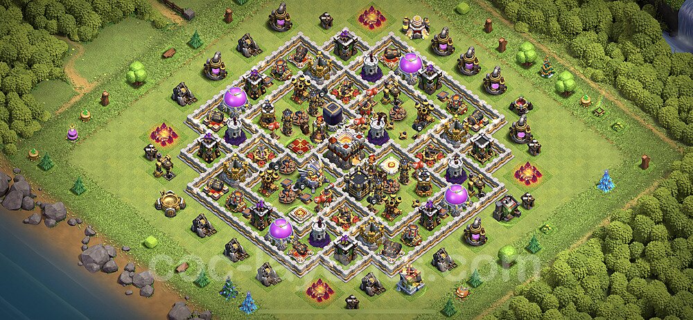 This Town Hall 11 hybrid base offers the best of both worlds - strong resource protection combined with effective trophy defense. The versatile design makes it an excellent choice for players who want to protect their loot while maintaining their trophy count. This balanced approach ensures you don't sacrifice one aspect of defense for another, making it ideal for active players across all league levels. The hybrid layout features centralized resource storages alongside a well-protected Town Hall, with multiple defensive layers that deter both farming raids and trophy pushers. High-value targets are strategically positioned within overlapping defense ranges, forcing attackers to make difficult choices about which objectives to prioritize. The compartmentalized design prevents attackers from easily achieving both loot destruction and the Town Hall kill in a single attack. Defense placement in this hybrid base creates strong coverage against both ground and air attacks. Inferno Towers, X-Bows, and Eagle Artillery work in concert to eliminate threats quickly, while splash damage defenses like Wizard Towers and Bomb Towers counter swarm strategies. The base's funnel-resistant design and strategic trap placement make it effective against popular attack strategies including QC LaLoon (Queen Charge Lava Hound Balloon), Blizzard attacks, and Yeti Smash compositions.