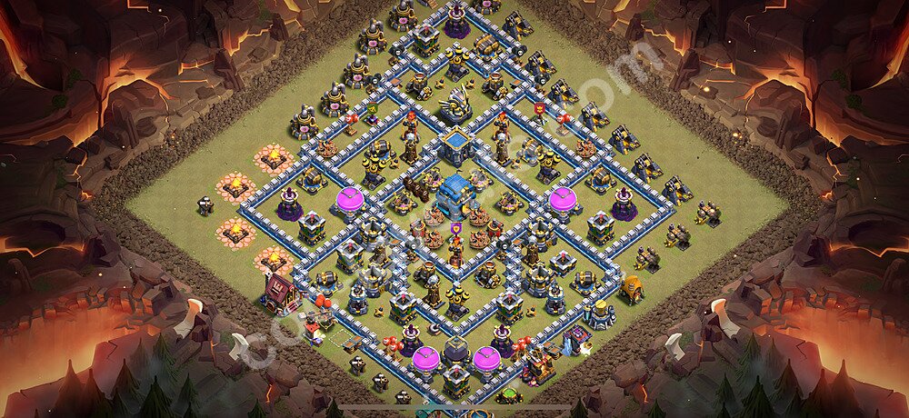 This Town Hall 12 war base is specifically designed to defend against 2-star and 3-star attacks in Clan Wars and Clan War Leagues. The strategic placement of defenses creates multiple compartments that force attackers to use more troops and spells than anticipated. Key defensive structures like Eagle Artillery, Inferno Towers, and X-Bows are positioned to cover crucial sections of the base, making it extremely difficult for opponents to secure a perfect attack. The core of this war base features a centralized Town Hall and Clan Castle, protected by multiple layers of walls and high-damage defenses. This layout forces attackers to commit significant resources just to reach the center, often leaving them without enough firepower to secure the Town Hall destruction. The anti-2-star design ensures that even if attackers breach the outer defenses, they'll struggle to achieve a 50% destruction rating. Air defenses are strategically spread to counter popular air attack strategies like LaLoon (Lava Hound + Balloons) and Electrone (Electro Dragons + Stone Slammer). The symmetrical trap placement and strategic Hidden Tesla positions create deadly surprise elements that can completely derail an attacker's plan. This base has been tested against various meta attack strategies and has consistently proven effective in preventing 3-star attacks.