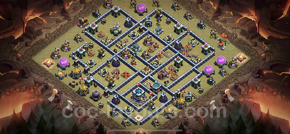 This Town Hall 13 war base is specifically designed to defend against 2-star and 3-star attacks in Clan Wars and Clan War Leagues. The strategic placement of defenses creates multiple compartments that force attackers to use more troops and spells than anticipated. Key defensive structures like Eagle Artillery, Inferno Towers, and X-Bows are positioned to cover crucial sections of the base, making it extremely difficult for opponents to secure a perfect attack. The core of this war base features a centralized Town Hall and Clan Castle, protected by multiple layers of walls and high-damage defenses. This layout forces attackers to commit significant resources just to reach the center, often leaving them without enough firepower to secure the Town Hall destruction. The anti-2-star design ensures that even if attackers breach the outer defenses, they'll struggle to achieve a 50% destruction rating. Air defenses are strategically spread to counter popular air attack strategies like LaLoon (Lava Hound + Balloons) and Electrone (Electro Dragons + Stone Slammer). The symmetrical trap placement and strategic Hidden Tesla positions create deadly surprise elements that can completely derail an attacker's plan. This base has been tested against various meta attack strategies and has consistently proven effective in preventing 3-star attacks.