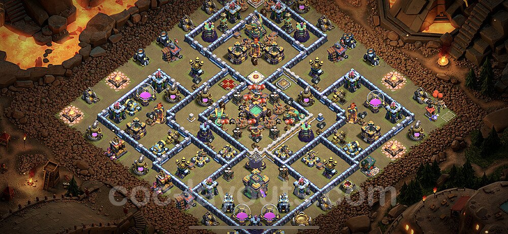 This Town Hall 14 hybrid base offers the best of both worlds - strong resource protection combined with effective trophy defense. The versatile design makes it an excellent choice for players who want to protect their loot while maintaining their trophy count. This balanced approach ensures you don't sacrifice one aspect of defense for another, making it ideal for active players across all league levels. The hybrid layout features centralized resource storages alongside a well-protected Town Hall, with multiple defensive layers that deter both farming raids and trophy pushers. High-value targets are strategically positioned within overlapping defense ranges, forcing attackers to make difficult choices about which objectives to prioritize. The compartmentalized design prevents attackers from easily achieving both loot destruction and the Town Hall kill in a single attack. Defense placement in this hybrid base creates strong coverage against both ground and air attacks. Inferno Towers, X-Bows, and Eagle Artillery work in concert to eliminate threats quickly, while splash damage defenses like Wizard Towers and Bomb Towers counter swarm strategies. The base's funnel-resistant design and strategic trap placement make it effective against popular attack strategies including QC LaLoon (Queen Charge Lava Hound Balloon), Blizzard attacks, and Yeti Smash compositions.