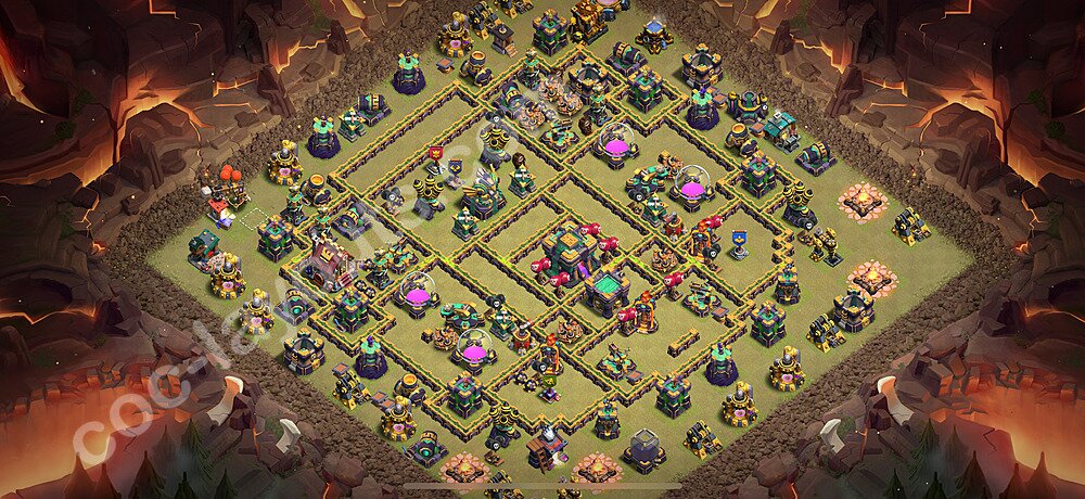 This Town Hall 14 war base is specifically designed to defend against 2-star and 3-star attacks in Clan Wars and Clan War Leagues. The strategic placement of defenses creates multiple compartments that force attackers to use more troops and spells than anticipated. Key defensive structures like Eagle Artillery, Inferno Towers, and X-Bows are positioned to cover crucial sections of the base, making it extremely difficult for opponents to secure a perfect attack. The core of this war base features a centralized Town Hall and Clan Castle, protected by multiple layers of walls and high-damage defenses. This layout forces attackers to commit significant resources just to reach the center, often leaving them without enough firepower to secure the Town Hall destruction. The anti-2-star design ensures that even if attackers breach the outer defenses, they'll struggle to achieve a 50% destruction rating. Air defenses are strategically spread to counter popular air attack strategies like LaLoon (Lava Hound + Balloons) and Electrone (Electro Dragons + Stone Slammer). The symmetrical trap placement and strategic Hidden Tesla positions create deadly surprise elements that can completely derail an attacker's plan. This base has been tested against various meta attack strategies and has consistently proven effective in preventing 3-star attacks.