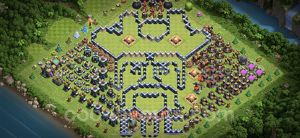 This Town Hall 14 war base is specifically designed to defend against 2-star and 3-star attacks in Clan Wars and Clan War Leagues. The strategic placement of defenses creates multiple compartments that force attackers to use more troops and spells than anticipated. Key defensive structures like Eagle Artillery, Inferno Towers, and X-Bows are positioned to cover crucial sections of the base, making it extremely difficult for opponents to secure a perfect attack. The core of this war base features a centralized Town Hall and Clan Castle, protected by multiple layers of walls and high-damage defenses. This layout forces attackers to commit significant resources just to reach the center, often leaving them without enough firepower to secure the Town Hall destruction. The anti-2-star design ensures that even if attackers breach the outer defenses, they'll struggle to achieve a 50% destruction rating. Air defenses are strategically spread to counter popular air attack strategies like LaLoon (Lava Hound + Balloons) and Electrone (Electro Dragons + Stone Slammer). The symmetrical trap placement and strategic Hidden Tesla positions create deadly surprise elements that can completely derail an attacker's plan. This base has been tested against various meta attack strategies and has consistently proven effective in preventing 3-star attacks.