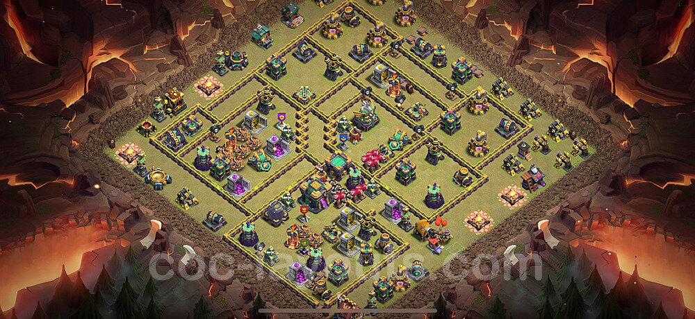 This Town Hall 14 war base is specifically designed to defend against 2-star and 3-star attacks in Clan Wars and Clan War Leagues. The strategic placement of defenses creates multiple compartments that force attackers to use more troops and spells than anticipated. Key defensive structures like Eagle Artillery, Inferno Towers, and X-Bows are positioned to cover crucial sections of the base, making it extremely difficult for opponents to secure a perfect attack. The core of this war base features a centralized Town Hall and Clan Castle, protected by multiple layers of walls and high-damage defenses. This layout forces attackers to commit significant resources just to reach the center, often leaving them without enough firepower to secure the Town Hall destruction. The anti-2-star design ensures that even if attackers breach the outer defenses, they'll struggle to achieve a 50% destruction rating. Air defenses are strategically spread to counter popular air attack strategies like LaLoon (Lava Hound + Balloons) and Electrone (Electro Dragons + Stone Slammer). The symmetrical trap placement and strategic Hidden Tesla positions create deadly surprise elements that can completely derail an attacker's plan. This base has been tested against various meta attack strategies and has consistently proven effective in preventing 3-star attacks.