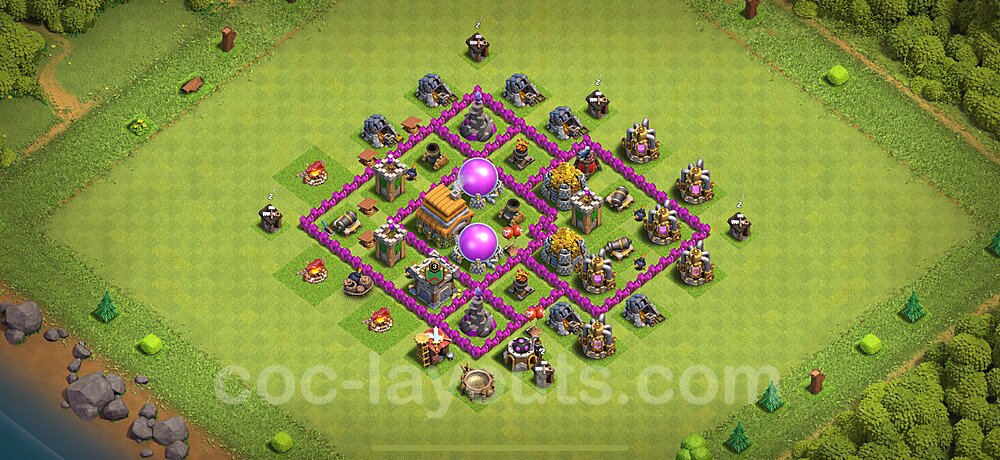 This Town Hall 6 farming base is optimized to protect your resources including Gold, Elixir, and Dark Elixir from raiders. The layout features centralized storages with multiple compartments that make it extremely difficult for attackers to steal large amounts of resources in a single raid. This design philosophy prioritizes resource protection over trophies, making it ideal for players focused on upgrading their village. The strategic placement of resource storages ensures they are well-protected by high-damage defenses like X-Bows, Inferno Towers, and Eagle Artillery. Each storage is surrounded by multiple wall layers and defensive structures, forcing attackers to invest heavily in troops and spells to reach your loot. The farming base design also incorporates strategic dead zones where attackers' troops tend to path inefficiently, wasting time and taking heavy damage from nearby defenses. Collectors and mines are positioned on the outer edges as "bait" while your main storages remain heavily protected in the core. This layout has proven effective against common farming strategies like BARCH (Barbarians + Archers), GoWiPe (Golems + Wizards + Pekka), and mass Miner attacks. The compartmentalized design prevents attackers from funneling straight to your resources, ensuring you maintain your hard-earned loot for important upgrades.