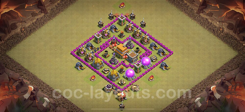 This Town Hall 6 hybrid base offers the best of both worlds - strong resource protection combined with effective trophy defense. The versatile design makes it an excellent choice for players who want to protect their loot while maintaining their trophy count. This balanced approach ensures you don't sacrifice one aspect of defense for another, making it ideal for active players across all league levels. The hybrid layout features centralized resource storages alongside a well-protected Town Hall, with multiple defensive layers that deter both farming raids and trophy pushers. High-value targets are strategically positioned within overlapping defense ranges, forcing attackers to make difficult choices about which objectives to prioritize. The compartmentalized design prevents attackers from easily achieving both loot destruction and the Town Hall kill in a single attack. Defense placement in this hybrid base creates strong coverage against both ground and air attacks. Inferno Towers, X-Bows, and Eagle Artillery work in concert to eliminate threats quickly, while splash damage defenses like Wizard Towers and Bomb Towers counter swarm strategies. The base's funnel-resistant design and strategic trap placement make it effective against popular attack strategies including QC LaLoon (Queen Charge Lava Hound Balloon), Blizzard attacks, and Yeti Smash compositions.