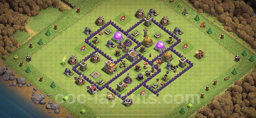 This Town Hall 7 hybrid base offers the best of both worlds - strong resource protection combined with effective trophy defense. The versatile design makes it an excellent choice for players who want to protect their loot while maintaining their trophy count. This balanced approach ensures you don't sacrifice one aspect of defense for another, making it ideal for active players across all league levels. The hybrid layout features centralized resource storages alongside a well-protected Town Hall, with multiple defensive layers that deter both farming raids and trophy pushers. High-value targets are strategically positioned within overlapping defense ranges, forcing attackers to make difficult choices about which objectives to prioritize. The compartmentalized design prevents attackers from easily achieving both loot destruction and the Town Hall kill in a single attack. Defense placement in this hybrid base creates strong coverage against both ground and air attacks. Inferno Towers, X-Bows, and Eagle Artillery work in concert to eliminate threats quickly, while splash damage defenses like Wizard Towers and Bomb Towers counter swarm strategies. The base's funnel-resistant design and strategic trap placement make it effective against popular attack strategies including QC LaLoon (Queen Charge Lava Hound Balloon), Blizzard attacks, and Yeti Smash compositions.