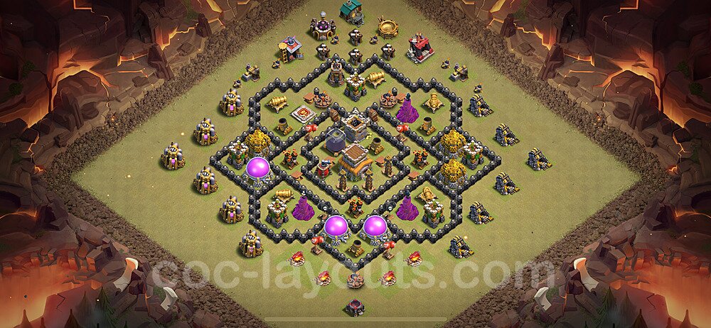 This Town Hall 8 hybrid base offers the best of both worlds - strong resource protection combined with effective trophy defense. The versatile design makes it an excellent choice for players who want to protect their loot while maintaining their trophy count. This balanced approach ensures you don't sacrifice one aspect of defense for another, making it ideal for active players across all league levels. The hybrid layout features centralized resource storages alongside a well-protected Town Hall, with multiple defensive layers that deter both farming raids and trophy pushers. High-value targets are strategically positioned within overlapping defense ranges, forcing attackers to make difficult choices about which objectives to prioritize. The compartmentalized design prevents attackers from easily achieving both loot destruction and the Town Hall kill in a single attack. Defense placement in this hybrid base creates strong coverage against both ground and air attacks. Inferno Towers, X-Bows, and Eagle Artillery work in concert to eliminate threats quickly, while splash damage defenses like Wizard Towers and Bomb Towers counter swarm strategies. The base's funnel-resistant design and strategic trap placement make it effective against popular attack strategies including QC LaLoon (Queen Charge Lava Hound Balloon), Blizzard attacks, and Yeti Smash compositions.