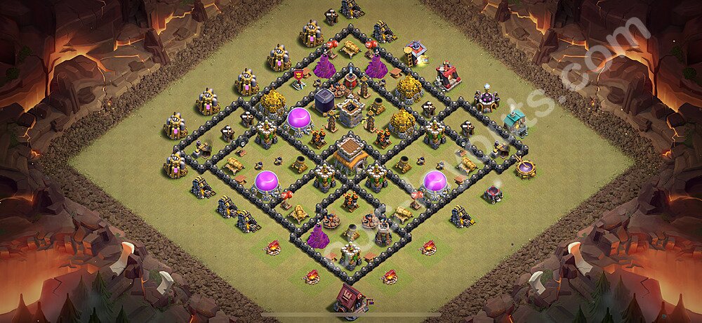 This Town Hall 8 war base is specifically designed to defend against 2-star and 3-star attacks in Clan Wars and Clan War Leagues. The strategic placement of defenses creates multiple compartments that force attackers to use more troops and spells than anticipated. Key defensive structures like Eagle Artillery, Inferno Towers, and X-Bows are positioned to cover crucial sections of the base, making it extremely difficult for opponents to secure a perfect attack. The core of this war base features a centralized Town Hall and Clan Castle, protected by multiple layers of walls and high-damage defenses. This layout forces attackers to commit significant resources just to reach the center, often leaving them without enough firepower to secure the Town Hall destruction. The anti-2-star design ensures that even if attackers breach the outer defenses, they'll struggle to achieve a 50% destruction rating. Air defenses are strategically spread to counter popular air attack strategies like LaLoon (Lava Hound + Balloons) and Electrone (Electro Dragons + Stone Slammer). The symmetrical trap placement and strategic Hidden Tesla positions create deadly surprise elements that can completely derail an attacker's plan. This base has been tested against various meta attack strategies and has consistently proven effective in preventing 3-star attacks.