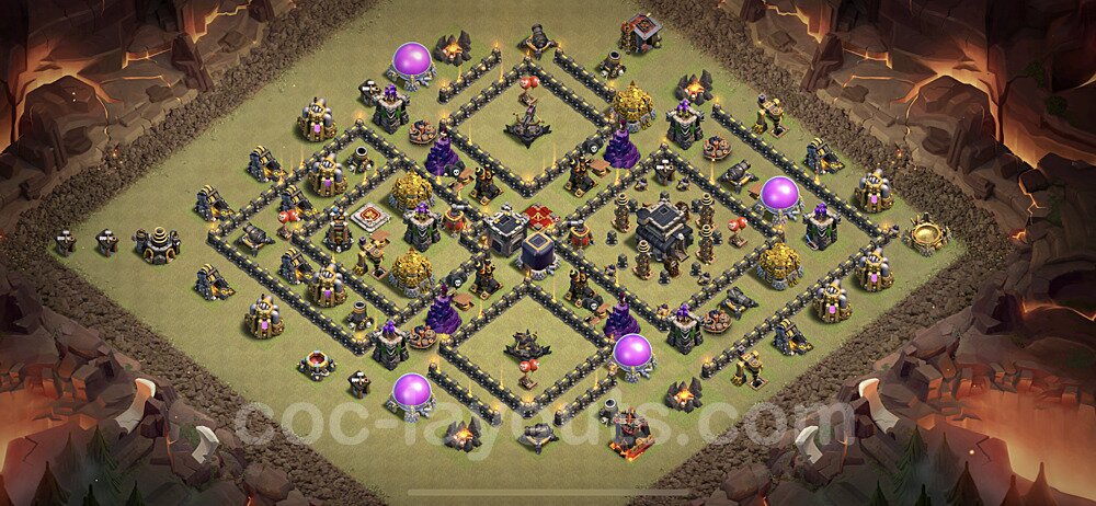 This Town Hall 9 war base is specifically designed to defend against 2-star and 3-star attacks in Clan Wars and Clan War Leagues. The strategic placement of defenses creates multiple compartments that force attackers to use more troops and spells than anticipated. Key defensive structures like Eagle Artillery, Inferno Towers, and X-Bows are positioned to cover crucial sections of the base, making it extremely difficult for opponents to secure a perfect attack. The core of this war base features a centralized Town Hall and Clan Castle, protected by multiple layers of walls and high-damage defenses. This layout forces attackers to commit significant resources just to reach the center, often leaving them without enough firepower to secure the Town Hall destruction. The anti-2-star design ensures that even if attackers breach the outer defenses, they'll struggle to achieve a 50% destruction rating. Air defenses are strategically spread to counter popular air attack strategies like LaLoon (Lava Hound + Balloons) and Electrone (Electro Dragons + Stone Slammer). The symmetrical trap placement and strategic Hidden Tesla positions create deadly surprise elements that can completely derail an attacker's plan. This base has been tested against various meta attack strategies and has consistently proven effective in preventing 3-star attacks.