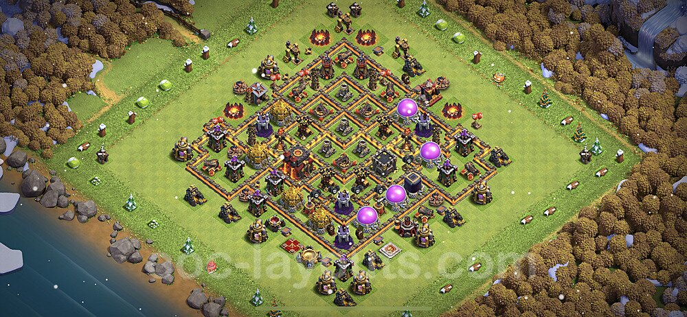 This Town Hall 10 war base is specifically designed to defend against 2-star and 3-star attacks in Clan Wars and Clan War Leagues. The strategic placement of defenses creates multiple compartments that force attackers to use more troops and spells than anticipated. Key defensive structures like Eagle Artillery, Inferno Towers, and X-Bows are positioned to cover crucial sections of the base, making it extremely difficult for opponents to secure a perfect attack. The core of this war base features a centralized Town Hall and Clan Castle, protected by multiple layers of walls and high-damage defenses. This layout forces attackers to commit significant resources just to reach the center, often leaving them without enough firepower to secure the Town Hall destruction. The anti-2-star design ensures that even if attackers breach the outer defenses, they'll struggle to achieve a 50% destruction rating. Air defenses are strategically spread to counter popular air attack strategies like LaLoon (Lava Hound + Balloons) and Electrone (Electro Dragons + Stone Slammer). The symmetrical trap placement and strategic Hidden Tesla positions create deadly surprise elements that can completely derail an attacker's plan. This base has been tested against various meta attack strategies and has consistently proven effective in preventing 3-star attacks.