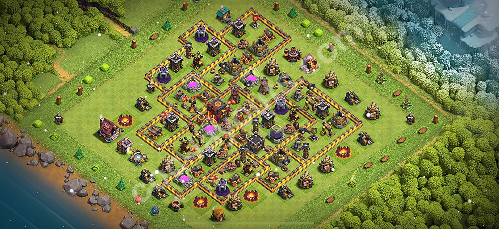 This Town Hall 10 war base is specifically designed to defend against 2-star and 3-star attacks in Clan Wars and Clan War Leagues. The strategic placement of defenses creates multiple compartments that force attackers to use more troops and spells than anticipated. Key defensive structures like Eagle Artillery, Inferno Towers, and X-Bows are positioned to cover crucial sections of the base, making it extremely difficult for opponents to secure a perfect attack. The core of this war base features a centralized Town Hall and Clan Castle, protected by multiple layers of walls and high-damage defenses. This layout forces attackers to commit significant resources just to reach the center, often leaving them without enough firepower to secure the Town Hall destruction. The anti-2-star design ensures that even if attackers breach the outer defenses, they'll struggle to achieve a 50% destruction rating. Air defenses are strategically spread to counter popular air attack strategies like LaLoon (Lava Hound + Balloons) and Electrone (Electro Dragons + Stone Slammer). The symmetrical trap placement and strategic Hidden Tesla positions create deadly surprise elements that can completely derail an attacker's plan. This base has been tested against various meta attack strategies and has consistently proven effective in preventing 3-star attacks.