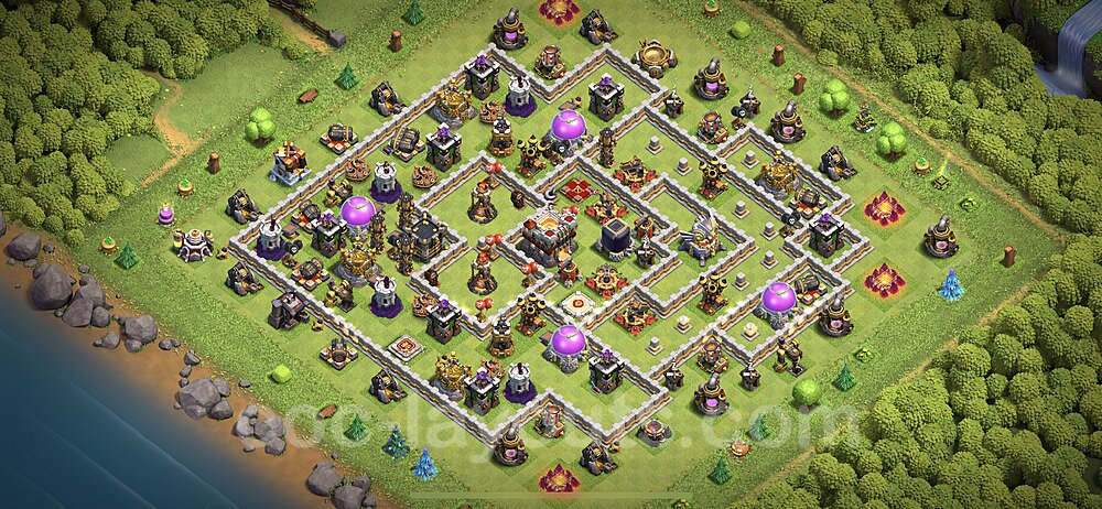 This Town Hall 11 hybrid base offers the best of both worlds - strong resource protection combined with effective trophy defense. The versatile design makes it an excellent choice for players who want to protect their loot while maintaining their trophy count. This balanced approach ensures you don't sacrifice one aspect of defense for another, making it ideal for active players across all league levels. The hybrid layout features centralized resource storages alongside a well-protected Town Hall, with multiple defensive layers that deter both farming raids and trophy pushers. High-value targets are strategically positioned within overlapping defense ranges, forcing attackers to make difficult choices about which objectives to prioritize. The compartmentalized design prevents attackers from easily achieving both loot destruction and the Town Hall kill in a single attack. Defense placement in this hybrid base creates strong coverage against both ground and air attacks. Inferno Towers, X-Bows, and Eagle Artillery work in concert to eliminate threats quickly, while splash damage defenses like Wizard Towers and Bomb Towers counter swarm strategies. The base's funnel-resistant design and strategic trap placement make it effective against popular attack strategies including QC LaLoon (Queen Charge Lava Hound Balloon), Blizzard attacks, and Yeti Smash compositions.
