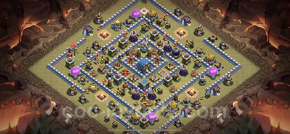 This Town Hall 12 war base is specifically designed to defend against 2-star and 3-star attacks in Clan Wars and Clan War Leagues. The strategic placement of defenses creates multiple compartments that force attackers to use more troops and spells than anticipated. Key defensive structures like Eagle Artillery, Inferno Towers, and X-Bows are positioned to cover crucial sections of the base, making it extremely difficult for opponents to secure a perfect attack. The core of this war base features a centralized Town Hall and Clan Castle, protected by multiple layers of walls and high-damage defenses. This layout forces attackers to commit significant resources just to reach the center, often leaving them without enough firepower to secure the Town Hall destruction. The anti-2-star design ensures that even if attackers breach the outer defenses, they'll struggle to achieve a 50% destruction rating. Air defenses are strategically spread to counter popular air attack strategies like LaLoon (Lava Hound + Balloons) and Electrone (Electro Dragons + Stone Slammer). The symmetrical trap placement and strategic Hidden Tesla positions create deadly surprise elements that can completely derail an attacker's plan. This base has been tested against various meta attack strategies and has consistently proven effective in preventing 3-star attacks.