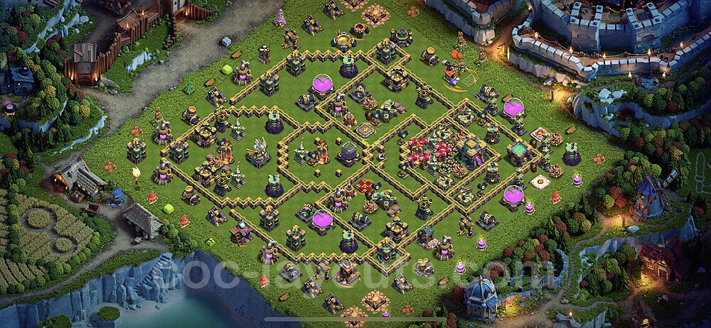 This Town Hall 14 war base is specifically designed to defend against 2-star and 3-star attacks in Clan Wars and Clan War Leagues. The strategic placement of defenses creates multiple compartments that force attackers to use more troops and spells than anticipated. Key defensive structures like Eagle Artillery, Inferno Towers, and X-Bows are positioned to cover crucial sections of the base, making it extremely difficult for opponents to secure a perfect attack. The core of this war base features a centralized Town Hall and Clan Castle, protected by multiple layers of walls and high-damage defenses. This layout forces attackers to commit significant resources just to reach the center, often leaving them without enough firepower to secure the Town Hall destruction. The anti-2-star design ensures that even if attackers breach the outer defenses, they'll struggle to achieve a 50% destruction rating. Air defenses are strategically spread to counter popular air attack strategies like LaLoon (Lava Hound + Balloons) and Electrone (Electro Dragons + Stone Slammer). The symmetrical trap placement and strategic Hidden Tesla positions create deadly surprise elements that can completely derail an attacker's plan. This base has been tested against various meta attack strategies and has consistently proven effective in preventing 3-star attacks.
