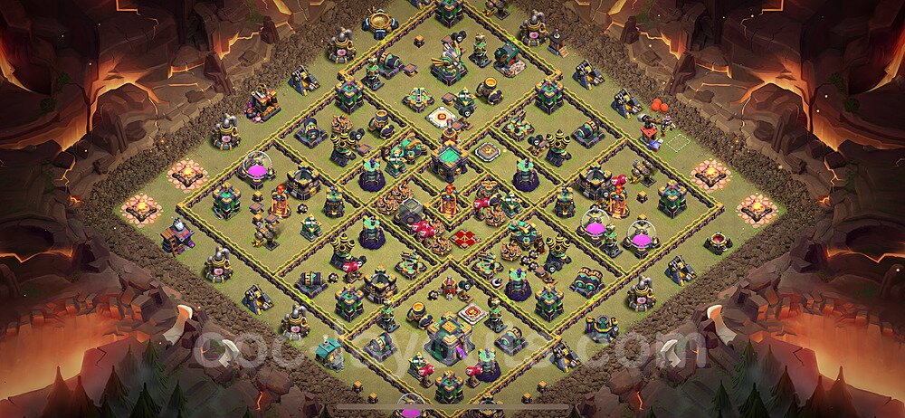 This Town Hall 14 war base is specifically designed to defend against 2-star and 3-star attacks in Clan Wars and Clan War Leagues. The strategic placement of defenses creates multiple compartments that force attackers to use more troops and spells than anticipated. Key defensive structures like Eagle Artillery, Inferno Towers, and X-Bows are positioned to cover crucial sections of the base, making it extremely difficult for opponents to secure a perfect attack. The core of this war base features a centralized Town Hall and Clan Castle, protected by multiple layers of walls and high-damage defenses. This layout forces attackers to commit significant resources just to reach the center, often leaving them without enough firepower to secure the Town Hall destruction. The anti-2-star design ensures that even if attackers breach the outer defenses, they'll struggle to achieve a 50% destruction rating. Air defenses are strategically spread to counter popular air attack strategies like LaLoon (Lava Hound + Balloons) and Electrone (Electro Dragons + Stone Slammer). The symmetrical trap placement and strategic Hidden Tesla positions create deadly surprise elements that can completely derail an attacker's plan. This base has been tested against various meta attack strategies and has consistently proven effective in preventing 3-star attacks.