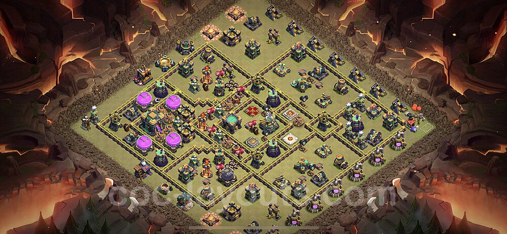 This Town Hall 14 war base is specifically designed to defend against 2-star and 3-star attacks in Clan Wars and Clan War Leagues. The strategic placement of defenses creates multiple compartments that force attackers to use more troops and spells than anticipated. Key defensive structures like Eagle Artillery, Inferno Towers, and X-Bows are positioned to cover crucial sections of the base, making it extremely difficult for opponents to secure a perfect attack. The core of this war base features a centralized Town Hall and Clan Castle, protected by multiple layers of walls and high-damage defenses. This layout forces attackers to commit significant resources just to reach the center, often leaving them without enough firepower to secure the Town Hall destruction. The anti-2-star design ensures that even if attackers breach the outer defenses, they'll struggle to achieve a 50% destruction rating. Air defenses are strategically spread to counter popular air attack strategies like LaLoon (Lava Hound + Balloons) and Electrone (Electro Dragons + Stone Slammer). The symmetrical trap placement and strategic Hidden Tesla positions create deadly surprise elements that can completely derail an attacker's plan. This base has been tested against various meta attack strategies and has consistently proven effective in preventing 3-star attacks.