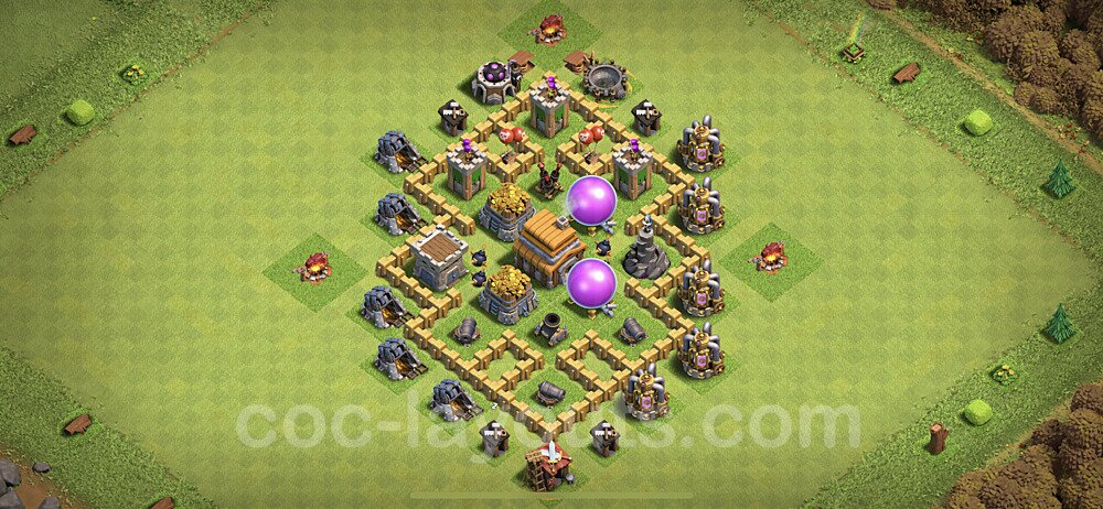 This Town Hall 5 hybrid base offers the best of both worlds - strong resource protection combined with effective trophy defense. The versatile design makes it an excellent choice for players who want to protect their loot while maintaining their trophy count. This balanced approach ensures you don't sacrifice one aspect of defense for another, making it ideal for active players across all league levels. The hybrid layout features centralized resource storages alongside a well-protected Town Hall, with multiple defensive layers that deter both farming raids and trophy pushers. High-value targets are strategically positioned within overlapping defense ranges, forcing attackers to make difficult choices about which objectives to prioritize. The compartmentalized design prevents attackers from easily achieving both loot destruction and the Town Hall kill in a single attack. Defense placement in this hybrid base creates strong coverage against both ground and air attacks. Inferno Towers, X-Bows, and Eagle Artillery work in concert to eliminate threats quickly, while splash damage defenses like Wizard Towers and Bomb Towers counter swarm strategies. The base's funnel-resistant design and strategic trap placement make it effective against popular attack strategies including QC LaLoon (Queen Charge Lava Hound Balloon), Blizzard attacks, and Yeti Smash compositions.