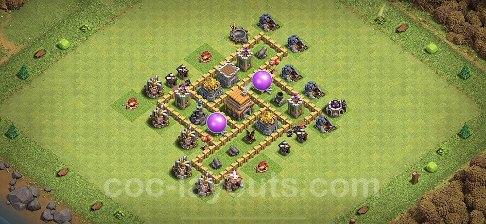This Town Hall 5 hybrid base offers the best of both worlds - strong resource protection combined with effective trophy defense. The versatile design makes it an excellent choice for players who want to protect their loot while maintaining their trophy count. This balanced approach ensures you don't sacrifice one aspect of defense for another, making it ideal for active players across all league levels. The hybrid layout features centralized resource storages alongside a well-protected Town Hall, with multiple defensive layers that deter both farming raids and trophy pushers. High-value targets are strategically positioned within overlapping defense ranges, forcing attackers to make difficult choices about which objectives to prioritize. The compartmentalized design prevents attackers from easily achieving both loot destruction and the Town Hall kill in a single attack. Defense placement in this hybrid base creates strong coverage against both ground and air attacks. Inferno Towers, X-Bows, and Eagle Artillery work in concert to eliminate threats quickly, while splash damage defenses like Wizard Towers and Bomb Towers counter swarm strategies. The base's funnel-resistant design and strategic trap placement make it effective against popular attack strategies including QC LaLoon (Queen Charge Lava Hound Balloon), Blizzard attacks, and Yeti Smash compositions.