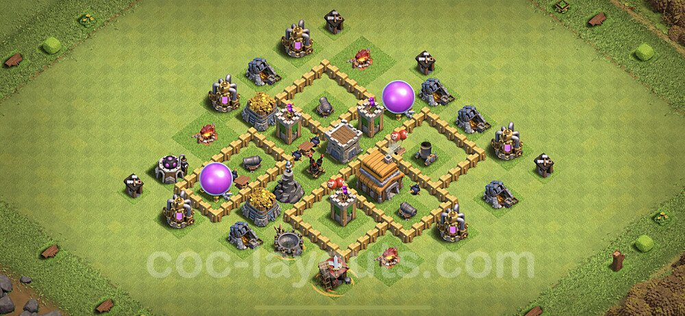 This Town Hall 5 war base is specifically designed to defend against 2-star and 3-star attacks in Clan Wars and Clan War Leagues. The strategic placement of defenses creates multiple compartments that force attackers to use more troops and spells than anticipated. Key defensive structures like Eagle Artillery, Inferno Towers, and X-Bows are positioned to cover crucial sections of the base, making it extremely difficult for opponents to secure a perfect attack. The core of this war base features a centralized Town Hall and Clan Castle, protected by multiple layers of walls and high-damage defenses. This layout forces attackers to commit significant resources just to reach the center, often leaving them without enough firepower to secure the Town Hall destruction. The anti-2-star design ensures that even if attackers breach the outer defenses, they'll struggle to achieve a 50% destruction rating. Air defenses are strategically spread to counter popular air attack strategies like LaLoon (Lava Hound + Balloons) and Electrone (Electro Dragons + Stone Slammer). The symmetrical trap placement and strategic Hidden Tesla positions create deadly surprise elements that can completely derail an attacker's plan. This base has been tested against various meta attack strategies and has consistently proven effective in preventing 3-star attacks.