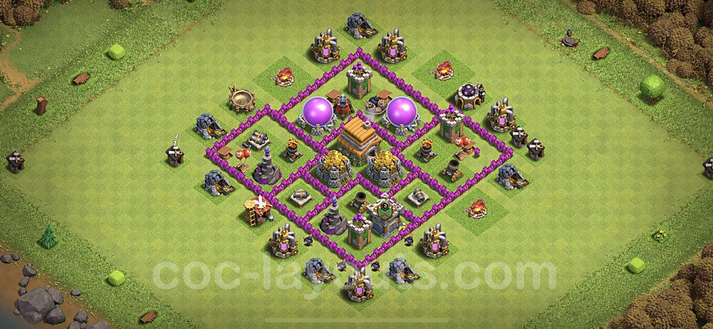 This Town Hall 6 hybrid base offers the best of both worlds - strong resource protection combined with effective trophy defense. The versatile design makes it an excellent choice for players who want to protect their loot while maintaining their trophy count. This balanced approach ensures you don't sacrifice one aspect of defense for another, making it ideal for active players across all league levels. The hybrid layout features centralized resource storages alongside a well-protected Town Hall, with multiple defensive layers that deter both farming raids and trophy pushers. High-value targets are strategically positioned within overlapping defense ranges, forcing attackers to make difficult choices about which objectives to prioritize. The compartmentalized design prevents attackers from easily achieving both loot destruction and the Town Hall kill in a single attack. Defense placement in this hybrid base creates strong coverage against both ground and air attacks. Inferno Towers, X-Bows, and Eagle Artillery work in concert to eliminate threats quickly, while splash damage defenses like Wizard Towers and Bomb Towers counter swarm strategies. The base's funnel-resistant design and strategic trap placement make it effective against popular attack strategies including QC LaLoon (Queen Charge Lava Hound Balloon), Blizzard attacks, and Yeti Smash compositions.