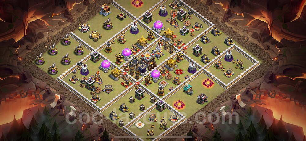 This Town Hall 11 hybrid base offers the best of both worlds - strong resource protection combined with effective trophy defense. The versatile design makes it an excellent choice for players who want to protect their loot while maintaining their trophy count. This balanced approach ensures you don't sacrifice one aspect of defense for another, making it ideal for active players across all league levels. The hybrid layout features centralized resource storages alongside a well-protected Town Hall, with multiple defensive layers that deter both farming raids and trophy pushers. High-value targets are strategically positioned within overlapping defense ranges, forcing attackers to make difficult choices about which objectives to prioritize. The compartmentalized design prevents attackers from easily achieving both loot destruction and the Town Hall kill in a single attack. Defense placement in this hybrid base creates strong coverage against both ground and air attacks. Inferno Towers, X-Bows, and Eagle Artillery work in concert to eliminate threats quickly, while splash damage defenses like Wizard Towers and Bomb Towers counter swarm strategies. The base's funnel-resistant design and strategic trap placement make it effective against popular attack strategies including QC LaLoon (Queen Charge Lava Hound Balloon), Blizzard attacks, and Yeti Smash compositions.