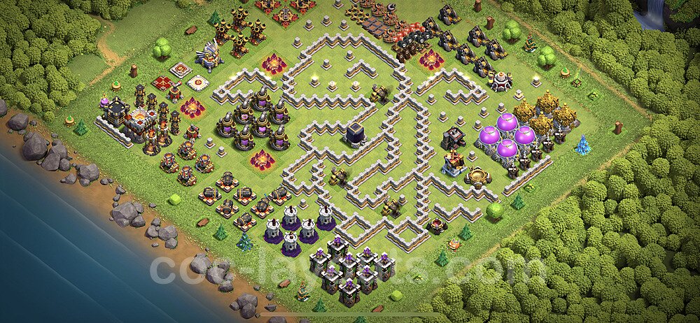 This Town Hall 11 war base is specifically designed to defend against 2-star and 3-star attacks in Clan Wars and Clan War Leagues. The strategic placement of defenses creates multiple compartments that force attackers to use more troops and spells than anticipated. Key defensive structures like Eagle Artillery, Inferno Towers, and X-Bows are positioned to cover crucial sections of the base, making it extremely difficult for opponents to secure a perfect attack. The core of this war base features a centralized Town Hall and Clan Castle, protected by multiple layers of walls and high-damage defenses. This layout forces attackers to commit significant resources just to reach the center, often leaving them without enough firepower to secure the Town Hall destruction. The anti-2-star design ensures that even if attackers breach the outer defenses, they'll struggle to achieve a 50% destruction rating. Air defenses are strategically spread to counter popular air attack strategies like LaLoon (Lava Hound + Balloons) and Electrone (Electro Dragons + Stone Slammer). The symmetrical trap placement and strategic Hidden Tesla positions create deadly surprise elements that can completely derail an attacker's plan. This base has been tested against various meta attack strategies and has consistently proven effective in preventing 3-star attacks.