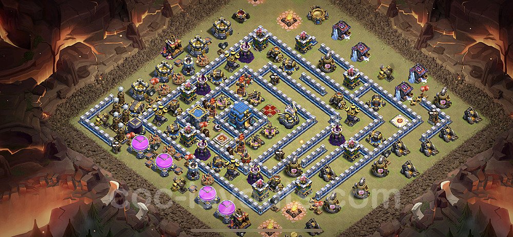 This Town Hall 12 war base is specifically designed to defend against 2-star and 3-star attacks in Clan Wars and Clan War Leagues. The strategic placement of defenses creates multiple compartments that force attackers to use more troops and spells than anticipated. Key defensive structures like Eagle Artillery, Inferno Towers, and X-Bows are positioned to cover crucial sections of the base, making it extremely difficult for opponents to secure a perfect attack. The core of this war base features a centralized Town Hall and Clan Castle, protected by multiple layers of walls and high-damage defenses. This layout forces attackers to commit significant resources just to reach the center, often leaving them without enough firepower to secure the Town Hall destruction. The anti-2-star design ensures that even if attackers breach the outer defenses, they'll struggle to achieve a 50% destruction rating. Air defenses are strategically spread to counter popular air attack strategies like LaLoon (Lava Hound + Balloons) and Electrone (Electro Dragons + Stone Slammer). The symmetrical trap placement and strategic Hidden Tesla positions create deadly surprise elements that can completely derail an attacker's plan. This base has been tested against various meta attack strategies and has consistently proven effective in preventing 3-star attacks.