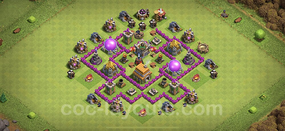 This Town Hall 6 hybrid base offers the best of both worlds - strong resource protection combined with effective trophy defense. The versatile design makes it an excellent choice for players who want to protect their loot while maintaining their trophy count. This balanced approach ensures you don't sacrifice one aspect of defense for another, making it ideal for active players across all league levels. The hybrid layout features centralized resource storages alongside a well-protected Town Hall, with multiple defensive layers that deter both farming raids and trophy pushers. High-value targets are strategically positioned within overlapping defense ranges, forcing attackers to make difficult choices about which objectives to prioritize. The compartmentalized design prevents attackers from easily achieving both loot destruction and the Town Hall kill in a single attack. Defense placement in this hybrid base creates strong coverage against both ground and air attacks. Inferno Towers, X-Bows, and Eagle Artillery work in concert to eliminate threats quickly, while splash damage defenses like Wizard Towers and Bomb Towers counter swarm strategies. The base's funnel-resistant design and strategic trap placement make it effective against popular attack strategies including QC LaLoon (Queen Charge Lava Hound Balloon), Blizzard attacks, and Yeti Smash compositions.