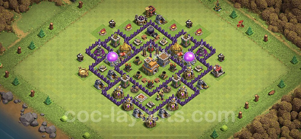 This Town Hall 7 war base is specifically designed to defend against 2-star and 3-star attacks in Clan Wars and Clan War Leagues. The strategic placement of defenses creates multiple compartments that force attackers to use more troops and spells than anticipated. Key defensive structures like Eagle Artillery, Inferno Towers, and X-Bows are positioned to cover crucial sections of the base, making it extremely difficult for opponents to secure a perfect attack. The core of this war base features a centralized Town Hall and Clan Castle, protected by multiple layers of walls and high-damage defenses. This layout forces attackers to commit significant resources just to reach the center, often leaving them without enough firepower to secure the Town Hall destruction. The anti-2-star design ensures that even if attackers breach the outer defenses, they'll struggle to achieve a 50% destruction rating. Air defenses are strategically spread to counter popular air attack strategies like LaLoon (Lava Hound + Balloons) and Electrone (Electro Dragons + Stone Slammer). The symmetrical trap placement and strategic Hidden Tesla positions create deadly surprise elements that can completely derail an attacker's plan. This base has been tested against various meta attack strategies and has consistently proven effective in preventing 3-star attacks.