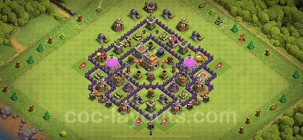This Town Hall 7 trophy pushing base is engineered for maximum defensive capability to help you climb and maintain higher trophy leagues. The design focuses on preventing attackers from achieving the 50% destruction threshold needed to steal trophies, with a heavily fortified Town Hall position and anti-2-star compartmentalization. This layout is perfect for competitive players aiming to reach Champion, Titan, or Legend League. The strategic placement of defenses creates overlapping coverage that makes it nearly impossible for attackers to access the core without facing devastating firepower. High-DPS defenses like Inferno Towers and Eagle Artillery are positioned to protect the Town Hall from all angles, while splash damage defenses counter mass troop strategies. The anti-air coverage is exceptionally strong, with Air Defenses, Air Sweepers, and Wizard Towers positioned to eliminate aerial threats quickly. Trap placement in this trophy base is optimized to counter popular attack strategies seen in higher leagues. Spring Traps are positioned to eliminate Hog Riders and Valkyries, while Giant Bombs target Balloons and Wall Breakers. The base's asymmetrical design confuses attackers' pathing algorithms, causing troops to split and take unnecessary damage. This layout has been battle-tested in Legend League and has consistently helped players maintain their trophies against skilled attackers.