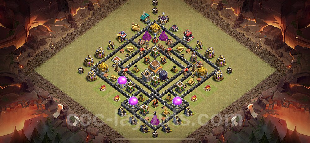 This Town Hall 8 hybrid base offers the best of both worlds - strong resource protection combined with effective trophy defense. The versatile design makes it an excellent choice for players who want to protect their loot while maintaining their trophy count. This balanced approach ensures you don't sacrifice one aspect of defense for another, making it ideal for active players across all league levels. The hybrid layout features centralized resource storages alongside a well-protected Town Hall, with multiple defensive layers that deter both farming raids and trophy pushers. High-value targets are strategically positioned within overlapping defense ranges, forcing attackers to make difficult choices about which objectives to prioritize. The compartmentalized design prevents attackers from easily achieving both loot destruction and the Town Hall kill in a single attack. Defense placement in this hybrid base creates strong coverage against both ground and air attacks. Inferno Towers, X-Bows, and Eagle Artillery work in concert to eliminate threats quickly, while splash damage defenses like Wizard Towers and Bomb Towers counter swarm strategies. The base's funnel-resistant design and strategic trap placement make it effective against popular attack strategies including QC LaLoon (Queen Charge Lava Hound Balloon), Blizzard attacks, and Yeti Smash compositions.