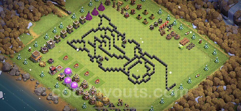 This Town Hall 8 war base is specifically designed to defend against 2-star and 3-star attacks in Clan Wars and Clan War Leagues. The strategic placement of defenses creates multiple compartments that force attackers to use more troops and spells than anticipated. Key defensive structures like Eagle Artillery, Inferno Towers, and X-Bows are positioned to cover crucial sections of the base, making it extremely difficult for opponents to secure a perfect attack. The core of this war base features a centralized Town Hall and Clan Castle, protected by multiple layers of walls and high-damage defenses. This layout forces attackers to commit significant resources just to reach the center, often leaving them without enough firepower to secure the Town Hall destruction. The anti-2-star design ensures that even if attackers breach the outer defenses, they'll struggle to achieve a 50% destruction rating. Air defenses are strategically spread to counter popular air attack strategies like LaLoon (Lava Hound + Balloons) and Electrone (Electro Dragons + Stone Slammer). The symmetrical trap placement and strategic Hidden Tesla positions create deadly surprise elements that can completely derail an attacker's plan. This base has been tested against various meta attack strategies and has consistently proven effective in preventing 3-star attacks.