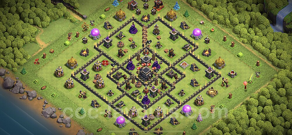 This Town Hall 9 war base is specifically designed to defend against 2-star and 3-star attacks in Clan Wars and Clan War Leagues. The strategic placement of defenses creates multiple compartments that force attackers to use more troops and spells than anticipated. Key defensive structures like Eagle Artillery, Inferno Towers, and X-Bows are positioned to cover crucial sections of the base, making it extremely difficult for opponents to secure a perfect attack. The core of this war base features a centralized Town Hall and Clan Castle, protected by multiple layers of walls and high-damage defenses. This layout forces attackers to commit significant resources just to reach the center, often leaving them without enough firepower to secure the Town Hall destruction. The anti-2-star design ensures that even if attackers breach the outer defenses, they'll struggle to achieve a 50% destruction rating. Air defenses are strategically spread to counter popular air attack strategies like LaLoon (Lava Hound + Balloons) and Electrone (Electro Dragons + Stone Slammer). The symmetrical trap placement and strategic Hidden Tesla positions create deadly surprise elements that can completely derail an attacker's plan. This base has been tested against various meta attack strategies and has consistently proven effective in preventing 3-star attacks.