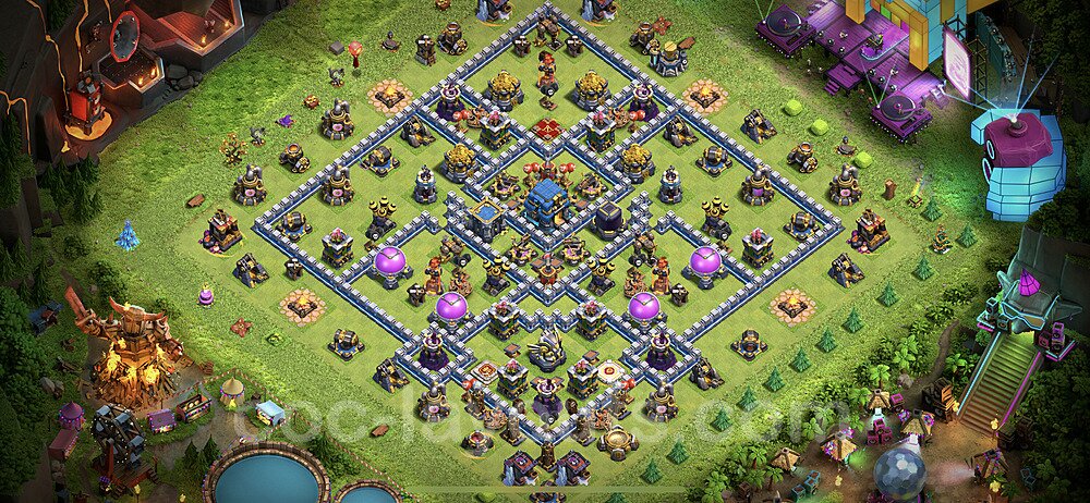 This Town Hall 12 hybrid base offers the best of both worlds - strong resource protection combined with effective trophy defense. The versatile design makes it an excellent choice for players who want to protect their loot while maintaining their trophy count. This balanced approach ensures you don't sacrifice one aspect of defense for another, making it ideal for active players across all league levels. The hybrid layout features centralized resource storages alongside a well-protected Town Hall, with multiple defensive layers that deter both farming raids and trophy pushers. High-value targets are strategically positioned within overlapping defense ranges, forcing attackers to make difficult choices about which objectives to prioritize. The compartmentalized design prevents attackers from easily achieving both loot destruction and the Town Hall kill in a single attack. Defense placement in this hybrid base creates strong coverage against both ground and air attacks. Inferno Towers, X-Bows, and Eagle Artillery work in concert to eliminate threats quickly, while splash damage defenses like Wizard Towers and Bomb Towers counter swarm strategies. The base's funnel-resistant design and strategic trap placement make it effective against popular attack strategies including QC LaLoon (Queen Charge Lava Hound Balloon), Blizzard attacks, and Yeti Smash compositions.