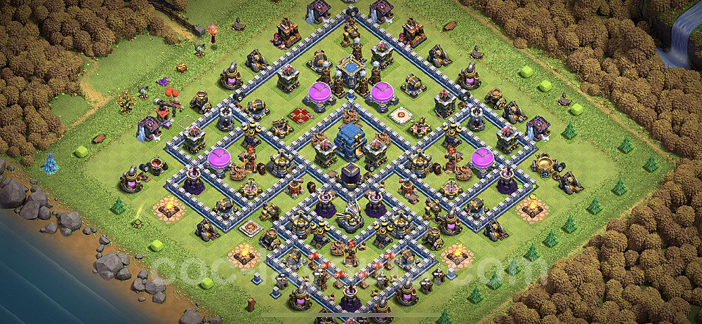 This Town Hall 12 hybrid base offers the best of both worlds - strong resource protection combined with effective trophy defense. The versatile design makes it an excellent choice for players who want to protect their loot while maintaining their trophy count. This balanced approach ensures you don't sacrifice one aspect of defense for another, making it ideal for active players across all league levels. The hybrid layout features centralized resource storages alongside a well-protected Town Hall, with multiple defensive layers that deter both farming raids and trophy pushers. High-value targets are strategically positioned within overlapping defense ranges, forcing attackers to make difficult choices about which objectives to prioritize. The compartmentalized design prevents attackers from easily achieving both loot destruction and the Town Hall kill in a single attack. Defense placement in this hybrid base creates strong coverage against both ground and air attacks. Inferno Towers, X-Bows, and Eagle Artillery work in concert to eliminate threats quickly, while splash damage defenses like Wizard Towers and Bomb Towers counter swarm strategies. The base's funnel-resistant design and strategic trap placement make it effective against popular attack strategies including QC LaLoon (Queen Charge Lava Hound Balloon), Blizzard attacks, and Yeti Smash compositions.