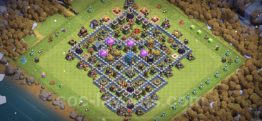 This Town Hall 12 hybrid base offers the best of both worlds - strong resource protection combined with effective trophy defense. The versatile design makes it an excellent choice for players who want to protect their loot while maintaining their trophy count. This balanced approach ensures you don't sacrifice one aspect of defense for another, making it ideal for active players across all league levels. The hybrid layout features centralized resource storages alongside a well-protected Town Hall, with multiple defensive layers that deter both farming raids and trophy pushers. High-value targets are strategically positioned within overlapping defense ranges, forcing attackers to make difficult choices about which objectives to prioritize. The compartmentalized design prevents attackers from easily achieving both loot destruction and the Town Hall kill in a single attack. Defense placement in this hybrid base creates strong coverage against both ground and air attacks. Inferno Towers, X-Bows, and Eagle Artillery work in concert to eliminate threats quickly, while splash damage defenses like Wizard Towers and Bomb Towers counter swarm strategies. The base's funnel-resistant design and strategic trap placement make it effective against popular attack strategies including QC LaLoon (Queen Charge Lava Hound Balloon), Blizzard attacks, and Yeti Smash compositions.