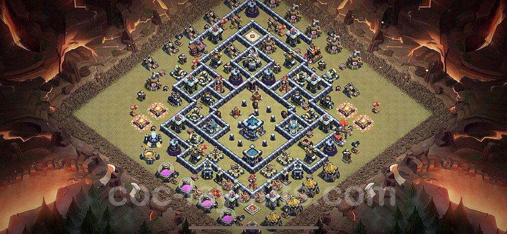 This Town Hall 13 war base is specifically designed to defend against 2-star and 3-star attacks in Clan Wars and Clan War Leagues. The strategic placement of defenses creates multiple compartments that force attackers to use more troops and spells than anticipated. Key defensive structures like Eagle Artillery, Inferno Towers, and X-Bows are positioned to cover crucial sections of the base, making it extremely difficult for opponents to secure a perfect attack. The core of this war base features a centralized Town Hall and Clan Castle, protected by multiple layers of walls and high-damage defenses. This layout forces attackers to commit significant resources just to reach the center, often leaving them without enough firepower to secure the Town Hall destruction. The anti-2-star design ensures that even if attackers breach the outer defenses, they'll struggle to achieve a 50% destruction rating. Air defenses are strategically spread to counter popular air attack strategies like LaLoon (Lava Hound + Balloons) and Electrone (Electro Dragons + Stone Slammer). The symmetrical trap placement and strategic Hidden Tesla positions create deadly surprise elements that can completely derail an attacker's plan. This base has been tested against various meta attack strategies and has consistently proven effective in preventing 3-star attacks.