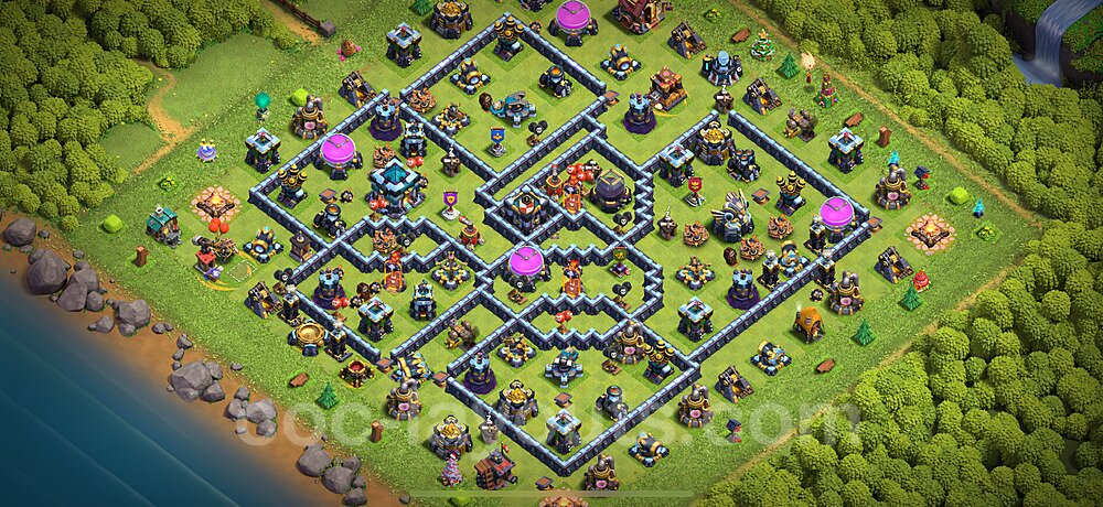 This Town Hall 13 war base is specifically designed to defend against 2-star and 3-star attacks in Clan Wars and Clan War Leagues. The strategic placement of defenses creates multiple compartments that force attackers to use more troops and spells than anticipated. Key defensive structures like Eagle Artillery, Inferno Towers, and X-Bows are positioned to cover crucial sections of the base, making it extremely difficult for opponents to secure a perfect attack. The core of this war base features a centralized Town Hall and Clan Castle, protected by multiple layers of walls and high-damage defenses. This layout forces attackers to commit significant resources just to reach the center, often leaving them without enough firepower to secure the Town Hall destruction. The anti-2-star design ensures that even if attackers breach the outer defenses, they'll struggle to achieve a 50% destruction rating. Air defenses are strategically spread to counter popular air attack strategies like LaLoon (Lava Hound + Balloons) and Electrone (Electro Dragons + Stone Slammer). The symmetrical trap placement and strategic Hidden Tesla positions create deadly surprise elements that can completely derail an attacker's plan. This base has been tested against various meta attack strategies and has consistently proven effective in preventing 3-star attacks.
