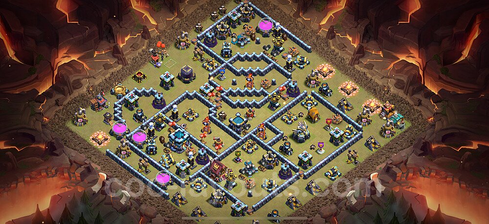 This Town Hall 13 war base is specifically designed to defend against 2-star and 3-star attacks in Clan Wars and Clan War Leagues. The strategic placement of defenses creates multiple compartments that force attackers to use more troops and spells than anticipated. Key defensive structures like Eagle Artillery, Inferno Towers, and X-Bows are positioned to cover crucial sections of the base, making it extremely difficult for opponents to secure a perfect attack. The core of this war base features a centralized Town Hall and Clan Castle, protected by multiple layers of walls and high-damage defenses. This layout forces attackers to commit significant resources just to reach the center, often leaving them without enough firepower to secure the Town Hall destruction. The anti-2-star design ensures that even if attackers breach the outer defenses, they'll struggle to achieve a 50% destruction rating. Air defenses are strategically spread to counter popular air attack strategies like LaLoon (Lava Hound + Balloons) and Electrone (Electro Dragons + Stone Slammer). The symmetrical trap placement and strategic Hidden Tesla positions create deadly surprise elements that can completely derail an attacker's plan. This base has been tested against various meta attack strategies and has consistently proven effective in preventing 3-star attacks.