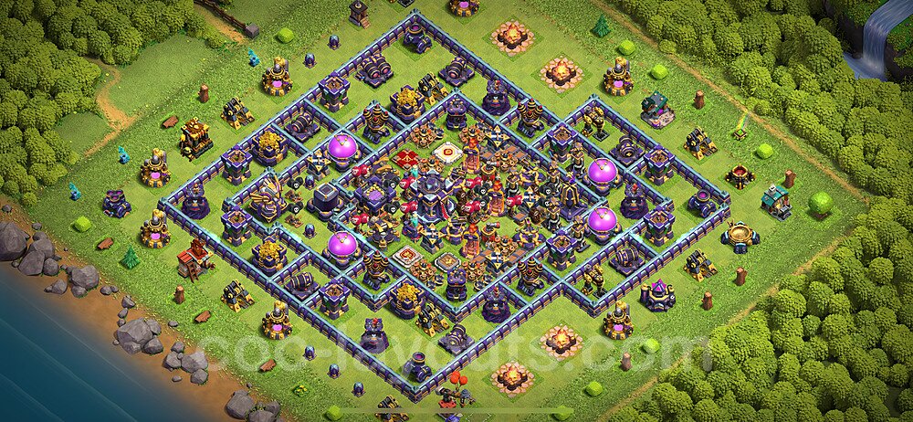 This Town Hall 15 hybrid base offers the best of both worlds - strong resource protection combined with effective trophy defense. The versatile design makes it an excellent choice for players who want to protect their loot while maintaining their trophy count. This balanced approach ensures you don't sacrifice one aspect of defense for another, making it ideal for active players across all league levels. The hybrid layout features centralized resource storages alongside a well-protected Town Hall, with multiple defensive layers that deter both farming raids and trophy pushers. High-value targets are strategically positioned within overlapping defense ranges, forcing attackers to make difficult choices about which objectives to prioritize. The compartmentalized design prevents attackers from easily achieving both loot destruction and the Town Hall kill in a single attack. Defense placement in this hybrid base creates strong coverage against both ground and air attacks. Inferno Towers, X-Bows, and Eagle Artillery work in concert to eliminate threats quickly, while splash damage defenses like Wizard Towers and Bomb Towers counter swarm strategies. The base's funnel-resistant design and strategic trap placement make it effective against popular attack strategies including QC LaLoon (Queen Charge Lava Hound Balloon), Blizzard attacks, and Yeti Smash compositions.