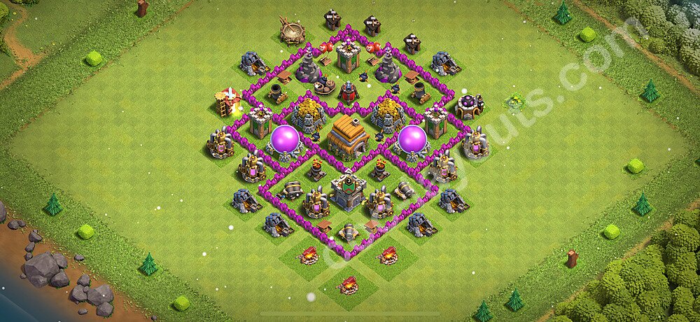 This Town Hall 6 farming base is optimized to protect your resources including Gold, Elixir, and Dark Elixir from raiders. The layout features centralized storages with multiple compartments that make it extremely difficult for attackers to steal large amounts of resources in a single raid. This design philosophy prioritizes resource protection over trophies, making it ideal for players focused on upgrading their village. The strategic placement of resource storages ensures they are well-protected by high-damage defenses like X-Bows, Inferno Towers, and Eagle Artillery. Each storage is surrounded by multiple wall layers and defensive structures, forcing attackers to invest heavily in troops and spells to reach your loot. The farming base design also incorporates strategic dead zones where attackers' troops tend to path inefficiently, wasting time and taking heavy damage from nearby defenses. Collectors and mines are positioned on the outer edges as "bait" while your main storages remain heavily protected in the core. This layout has proven effective against common farming strategies like BARCH (Barbarians + Archers), GoWiPe (Golems + Wizards + Pekka), and mass Miner attacks. The compartmentalized design prevents attackers from funneling straight to your resources, ensuring you maintain your hard-earned loot for important upgrades.