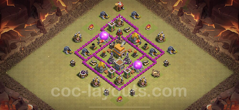 This Town Hall 6 hybrid base offers the best of both worlds - strong resource protection combined with effective trophy defense. The versatile design makes it an excellent choice for players who want to protect their loot while maintaining their trophy count. This balanced approach ensures you don't sacrifice one aspect of defense for another, making it ideal for active players across all league levels. The hybrid layout features centralized resource storages alongside a well-protected Town Hall, with multiple defensive layers that deter both farming raids and trophy pushers. High-value targets are strategically positioned within overlapping defense ranges, forcing attackers to make difficult choices about which objectives to prioritize. The compartmentalized design prevents attackers from easily achieving both loot destruction and the Town Hall kill in a single attack. Defense placement in this hybrid base creates strong coverage against both ground and air attacks. Inferno Towers, X-Bows, and Eagle Artillery work in concert to eliminate threats quickly, while splash damage defenses like Wizard Towers and Bomb Towers counter swarm strategies. The base's funnel-resistant design and strategic trap placement make it effective against popular attack strategies including QC LaLoon (Queen Charge Lava Hound Balloon), Blizzard attacks, and Yeti Smash compositions.