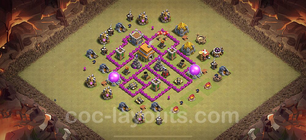 This Town Hall 6 war base is specifically designed to defend against 2-star and 3-star attacks in Clan Wars and Clan War Leagues. The strategic placement of defenses creates multiple compartments that force attackers to use more troops and spells than anticipated. Key defensive structures like Eagle Artillery, Inferno Towers, and X-Bows are positioned to cover crucial sections of the base, making it extremely difficult for opponents to secure a perfect attack. The core of this war base features a centralized Town Hall and Clan Castle, protected by multiple layers of walls and high-damage defenses. This layout forces attackers to commit significant resources just to reach the center, often leaving them without enough firepower to secure the Town Hall destruction. The anti-2-star design ensures that even if attackers breach the outer defenses, they'll struggle to achieve a 50% destruction rating. Air defenses are strategically spread to counter popular air attack strategies like LaLoon (Lava Hound + Balloons) and Electrone (Electro Dragons + Stone Slammer). The symmetrical trap placement and strategic Hidden Tesla positions create deadly surprise elements that can completely derail an attacker's plan. This base has been tested against various meta attack strategies and has consistently proven effective in preventing 3-star attacks.