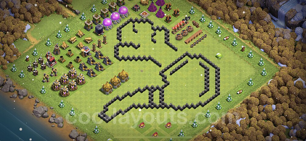 This Town Hall 8 war base is specifically designed to defend against 2-star and 3-star attacks in Clan Wars and Clan War Leagues. The strategic placement of defenses creates multiple compartments that force attackers to use more troops and spells than anticipated. Key defensive structures like Eagle Artillery, Inferno Towers, and X-Bows are positioned to cover crucial sections of the base, making it extremely difficult for opponents to secure a perfect attack. The core of this war base features a centralized Town Hall and Clan Castle, protected by multiple layers of walls and high-damage defenses. This layout forces attackers to commit significant resources just to reach the center, often leaving them without enough firepower to secure the Town Hall destruction. The anti-2-star design ensures that even if attackers breach the outer defenses, they'll struggle to achieve a 50% destruction rating. Air defenses are strategically spread to counter popular air attack strategies like LaLoon (Lava Hound + Balloons) and Electrone (Electro Dragons + Stone Slammer). The symmetrical trap placement and strategic Hidden Tesla positions create deadly surprise elements that can completely derail an attacker's plan. This base has been tested against various meta attack strategies and has consistently proven effective in preventing 3-star attacks.